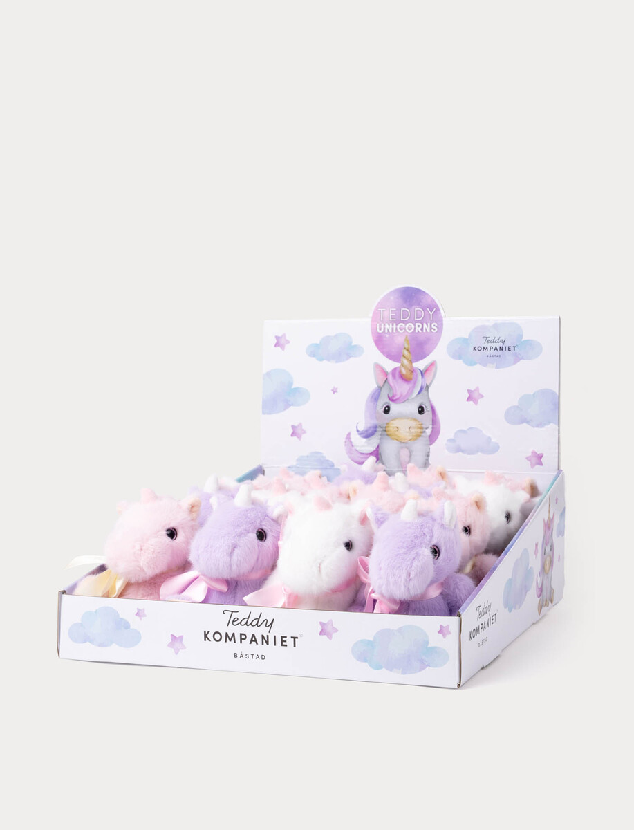 Nydelige enhjørninger med sløyfe. Leveres i et praktisk display med 16 stk. Kan vaskes på 40 grader. Godkjent fra 0+.