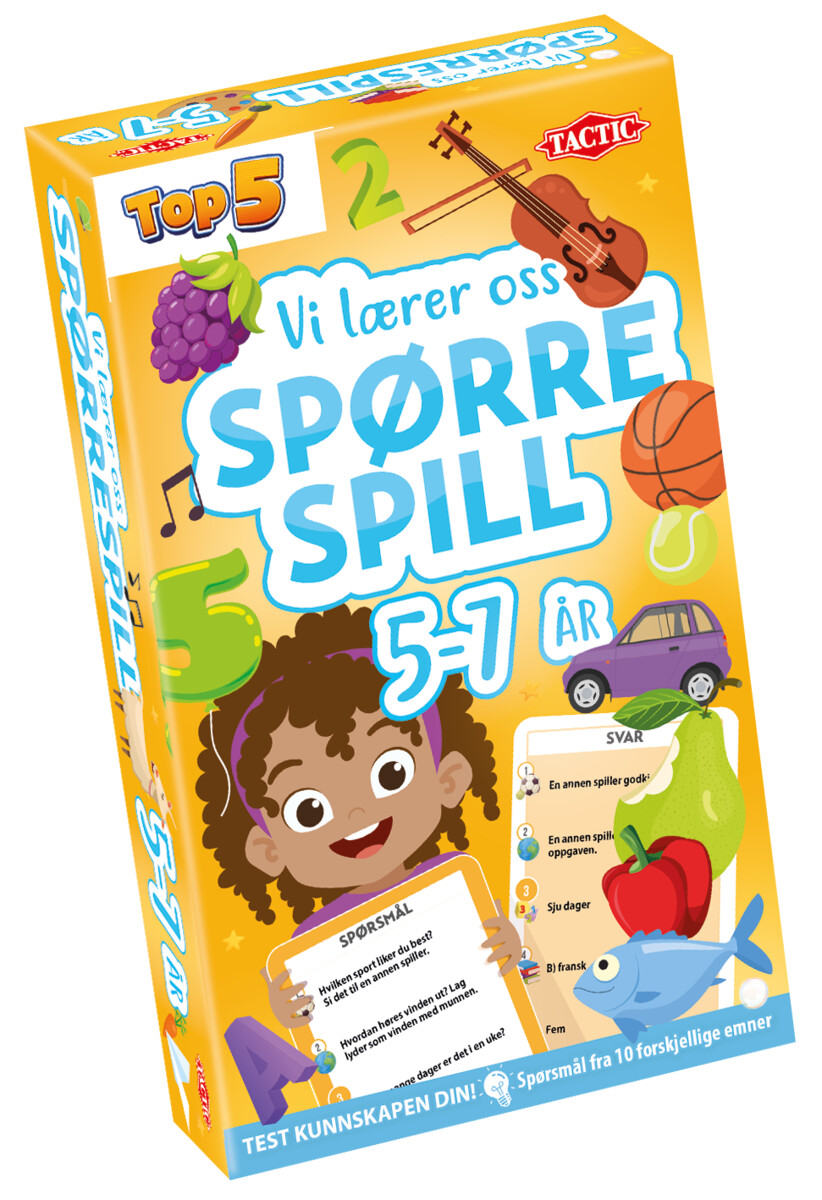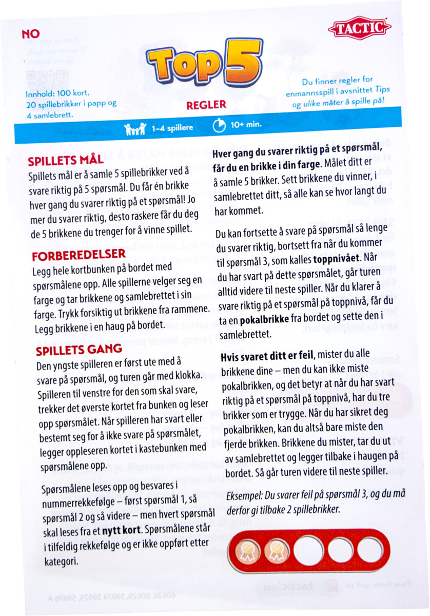 Hei, lille utforsker! Hopp inn i moroa og lær nye ting gjennom spill. Dette spillet inneholder 500 spørsmål – se hvor mye du allerede kan! Reglene kunne ikke vært enklere – bare skaff 5 spillebrikker ved å svare riktig på 5 spørsmål. Kommer du opp til toppnivå, kan du ikke miste poengene dine. Du kan velge å ikke svare hvis du ikke har lyst til å gjette. Det finnes flere Top5-spill å samle på. Dere kan stille spørsmål til hver enkelt ut fra spillerens ferdighetsnivå, eller stokke kortene og lære av hverandre!